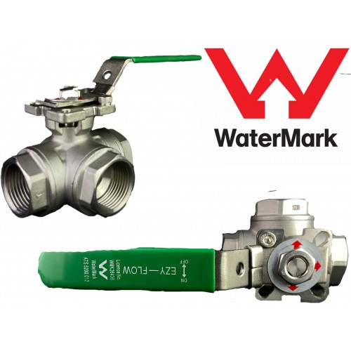 Three way Stainless Steel ball valve, reduced bore, BSP threaded end, 1000 WOG, with mounting pad, T port valve. These valves are available from 1/4" (8mm) to 3" (80mm).